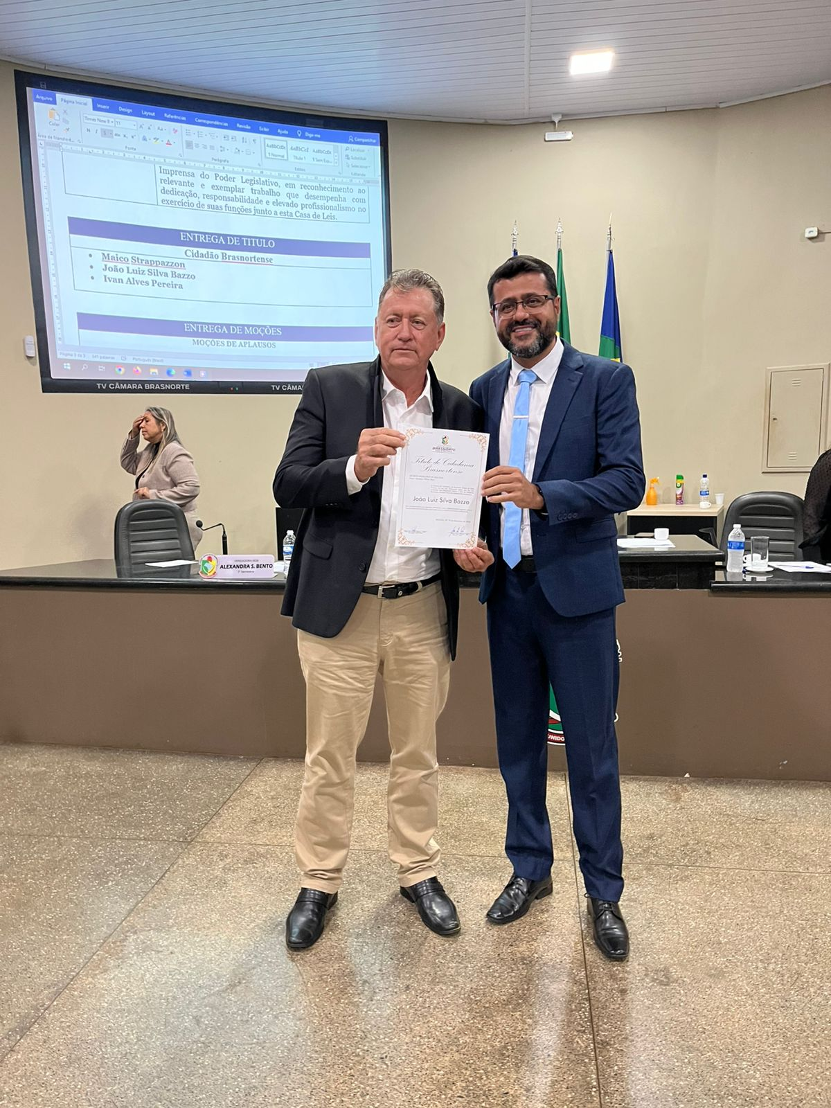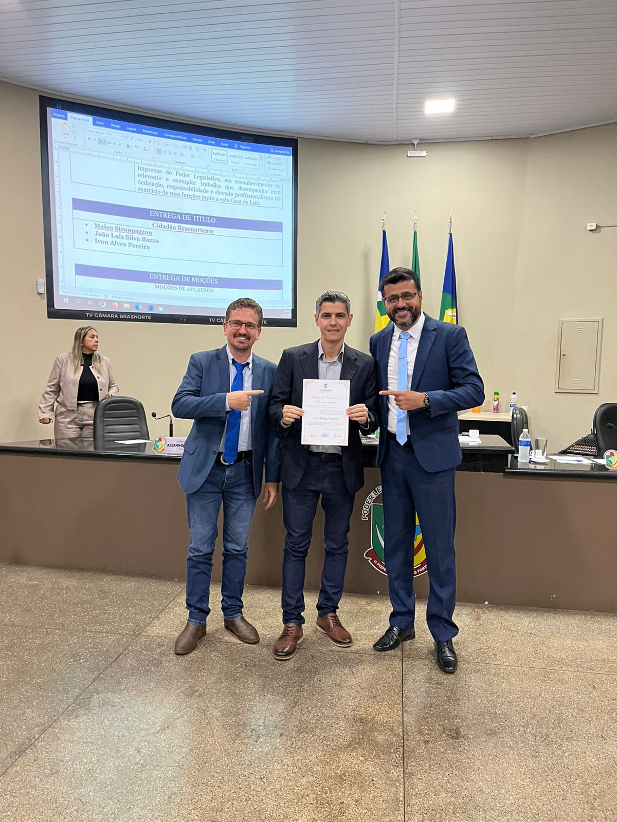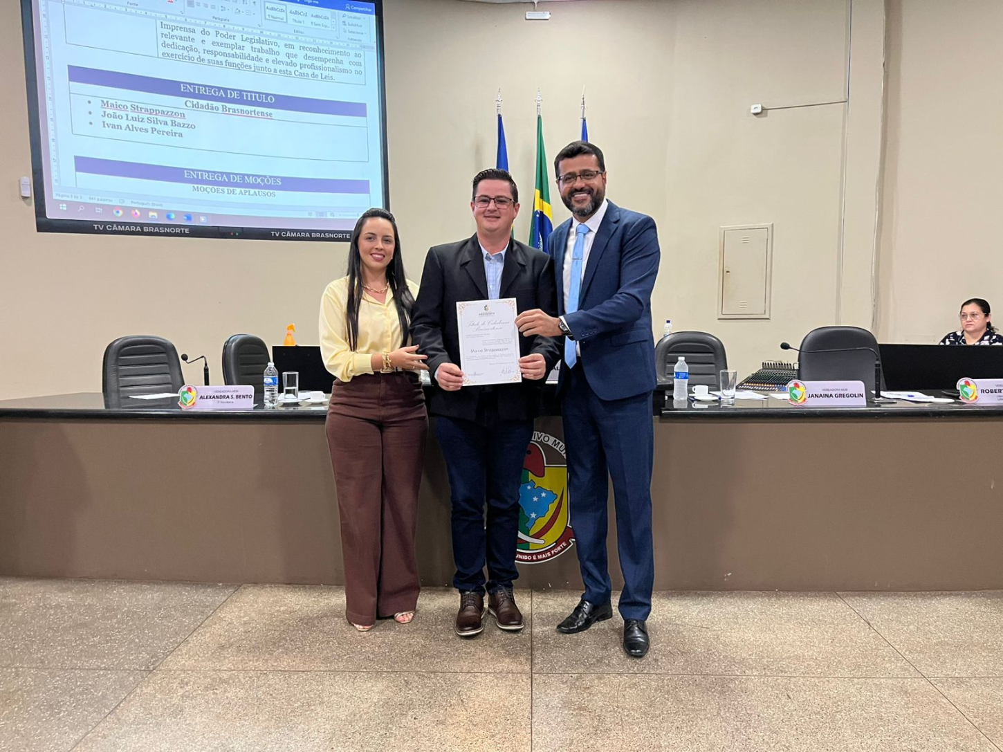 O jornalista Maico Strappazzon recebeu o título em clima de despedida. Após 10 anos de atuação em Brasnorte, ele se prepara para um novo desafio profissional, assumindo a direção da Band FM de Tangará da Serra. Em seu discurso, Maico destacou a relação construída com a cidade.